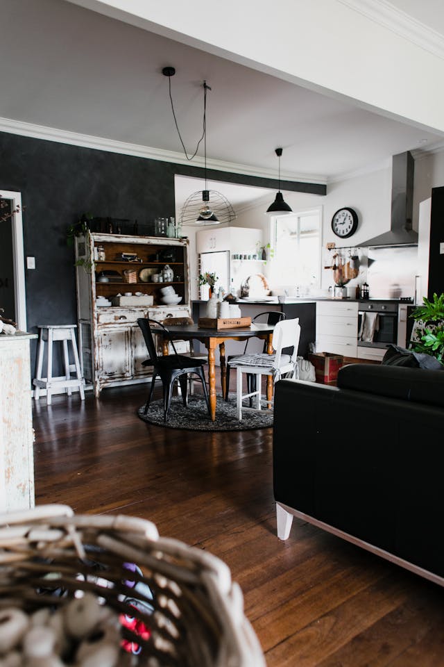 Moderne landelijke keuken met houten vloer, eettafel en vintage kast.